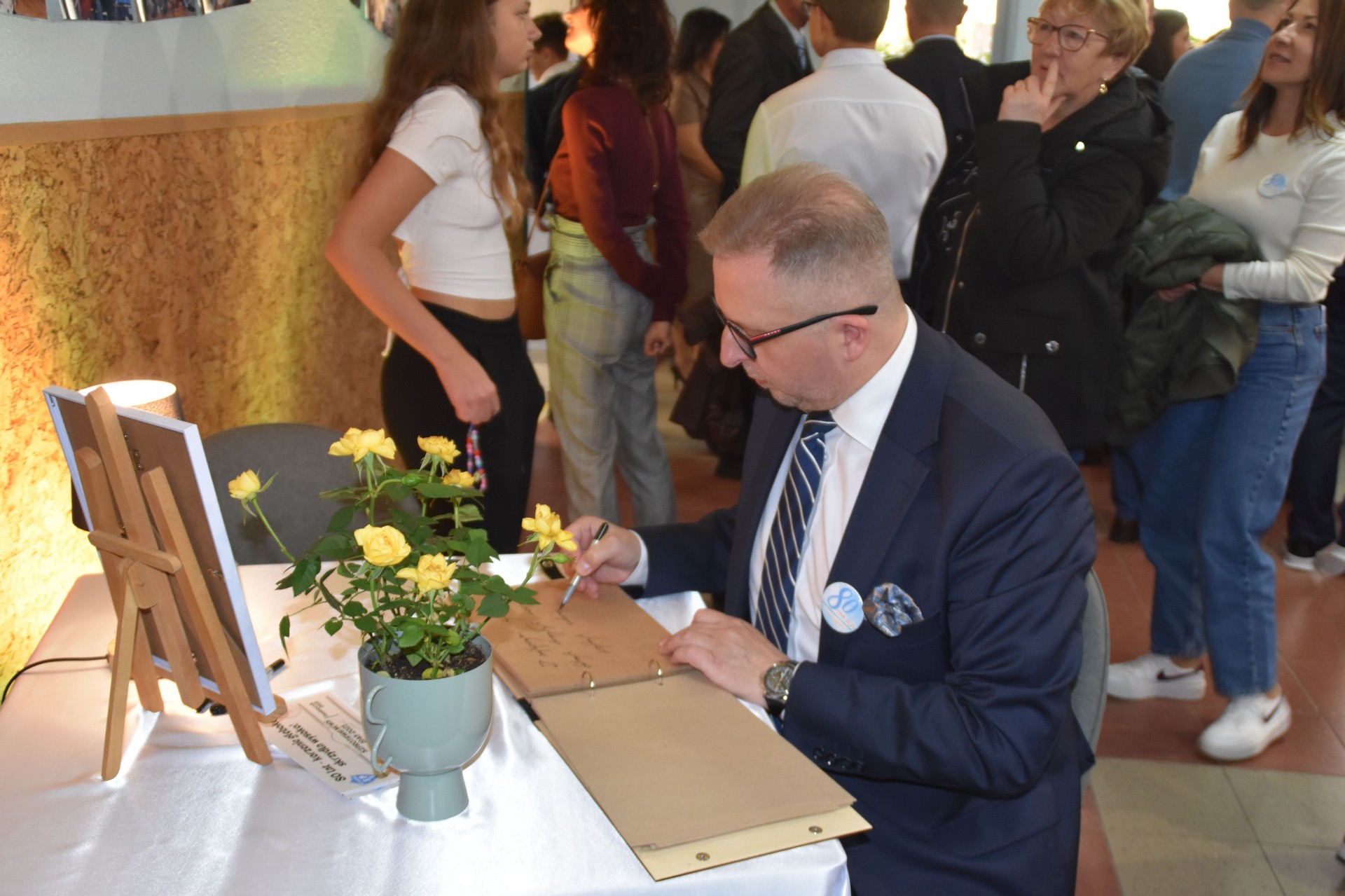 Szczególnym momentem było wręczenie statuetek „Złote Skrzydła” – symbolicznego podziękowania dla tych, którzy wspierają szkołę, pomagają jej się rozwijać i wierzą w jej misję. Nie zabrakło wzruszeń. W filmie z kronik szkolnych przewijały się twarze dawnych nauczycieli i uczniów, kadry klasowe sprzed dziesięcioleci, uśmiechy utrwalone na pożółkłych fotografiach. Czas wydawał się zatrzymać, a sala wypełniła się ciszą wspomnień. Jakby każda ławka, każdy dzwonek i każdy szkolny korytarz opowiadał własną historię.